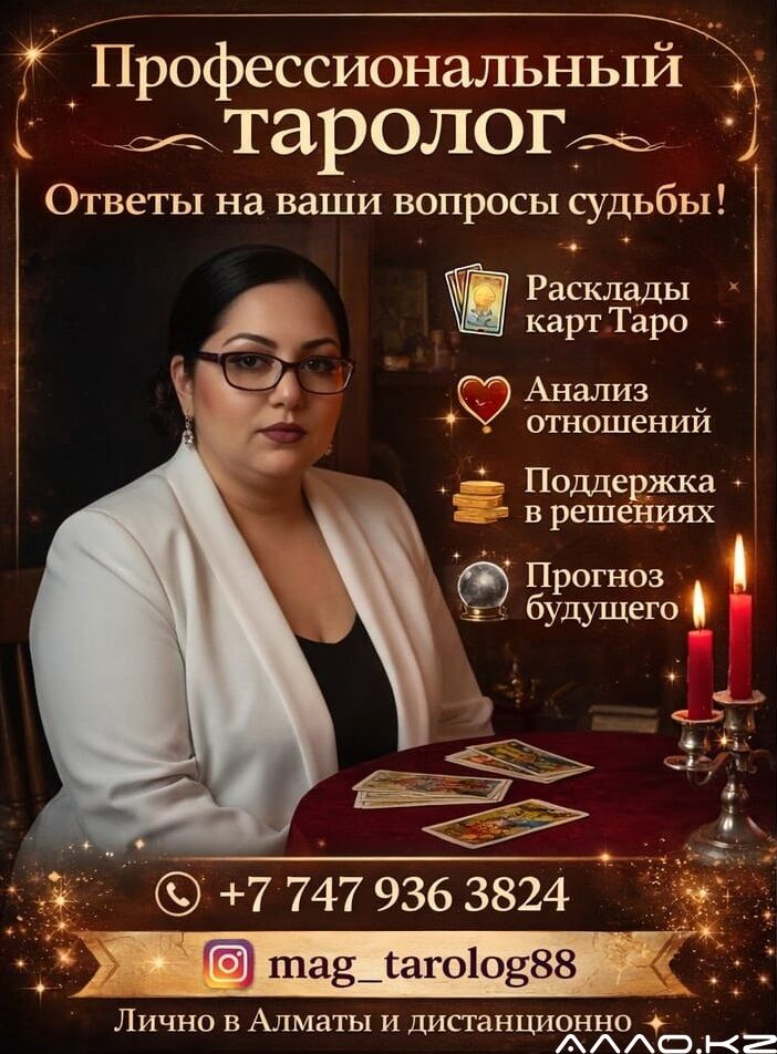 - Таро и Помощь в Алматы | Личный приём. Помогаю найти выход из сложных жизненных ситуаций. Провожу личный приём в городе Алматы . Мои услуги: - Гадание на Таро: детальный разбор вашего прошлого, настоящего и будущего. - Работа с негативом: очищение, снятие порчи, сглаза и любого энергетического груза. - Семейные отношения: гармонизация связи, возвращение мира в дом и помощь в любви. Если чувствуете, что в жизни наступила черная полоса или отношения зашли в тупик — помогу разобраться и найти решение . Место: Алматы, личный приём. Запись в WhatsApp: https://wa.me/77479363824 Instagram: https://www.instagram.com/mag_tarolog88